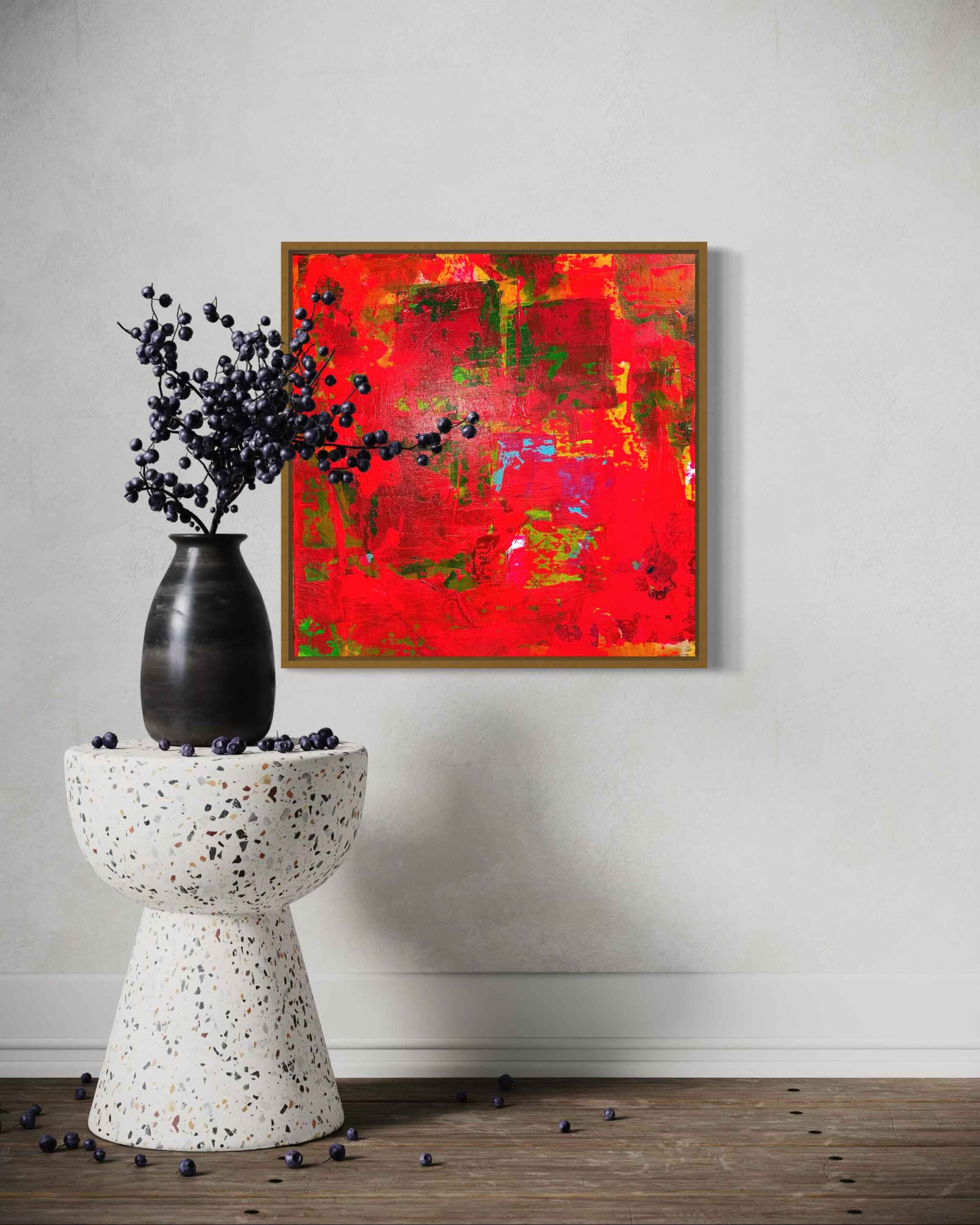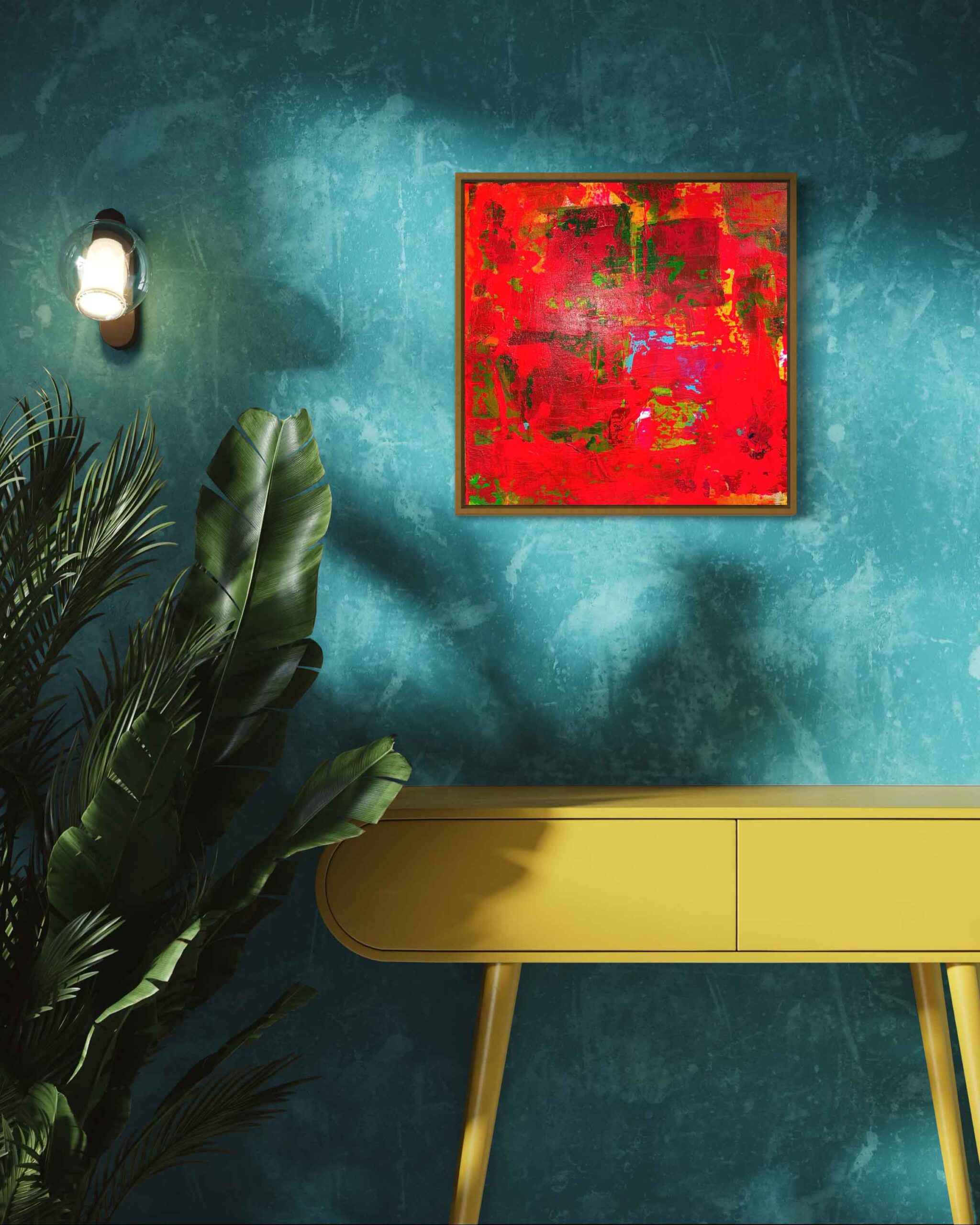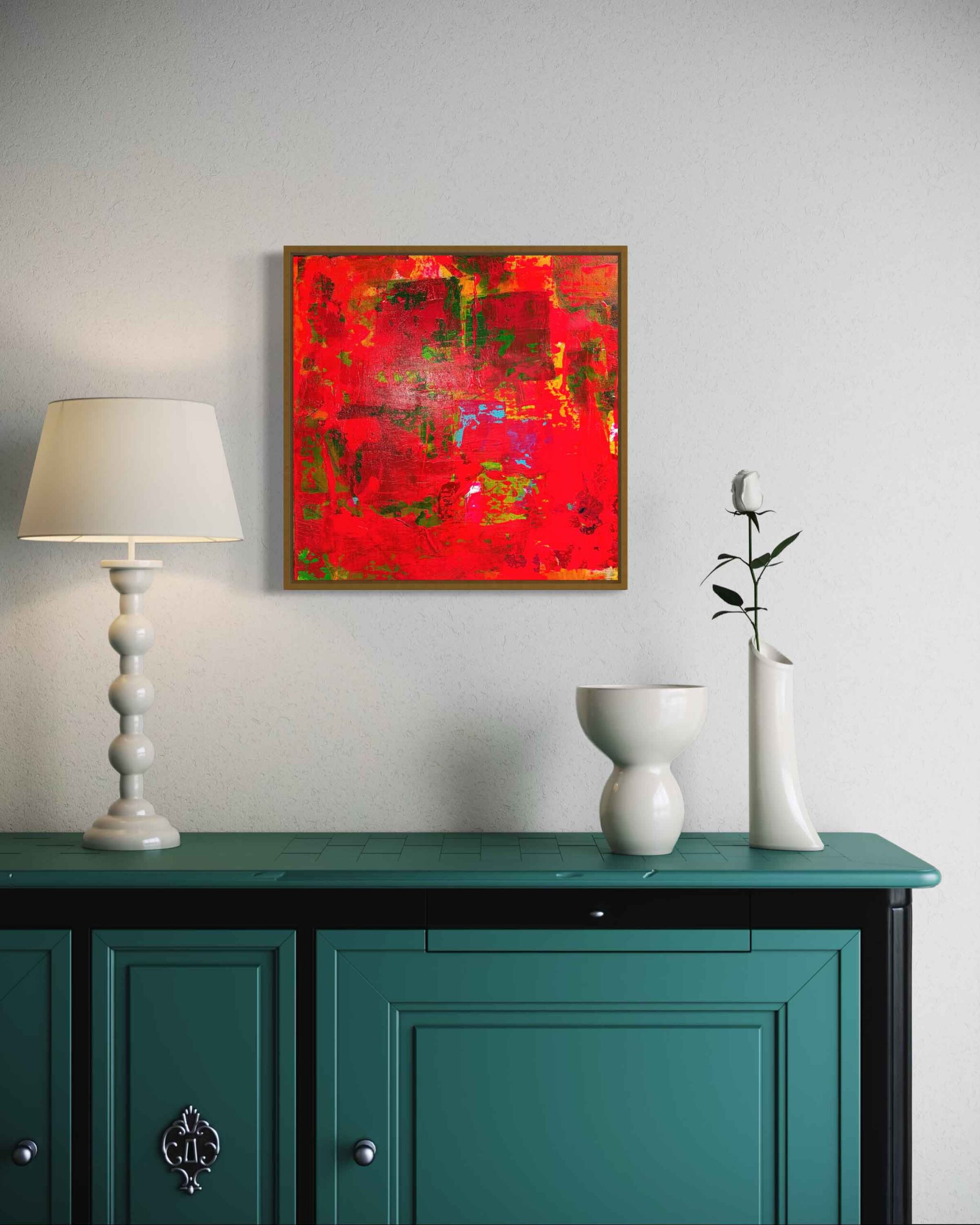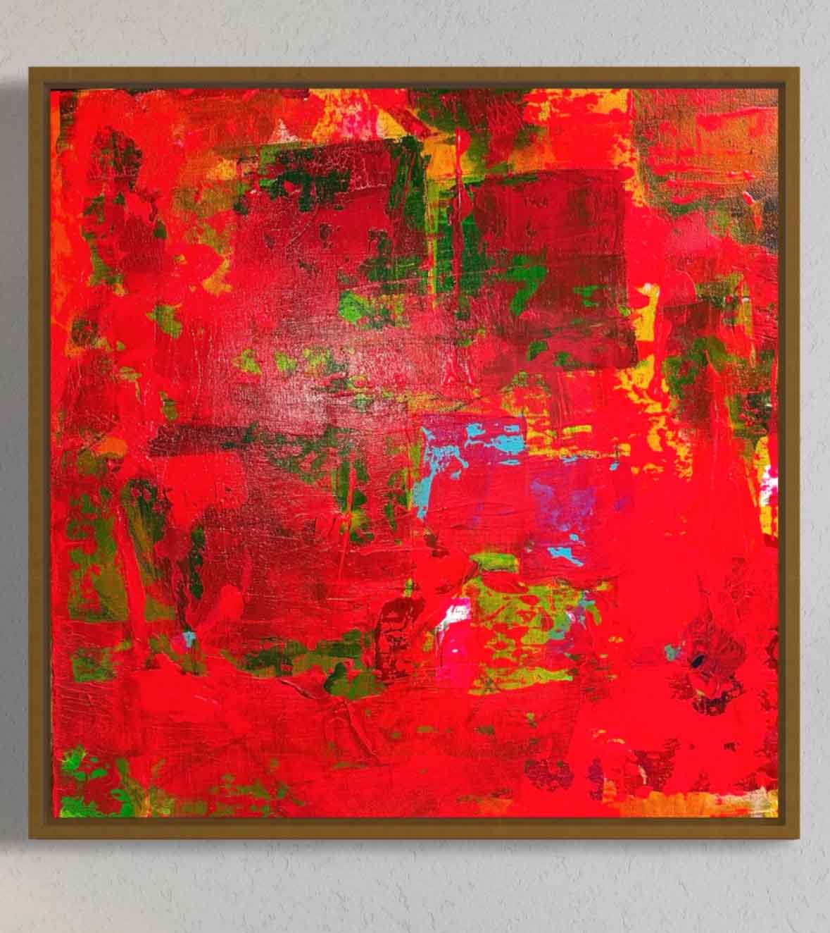 A vibrant abstract landscape inspired by the colors of autumn. Bold reds, oranges, and yellows blend with earthy greens and deep blues, creating a striking statement piece for any space.