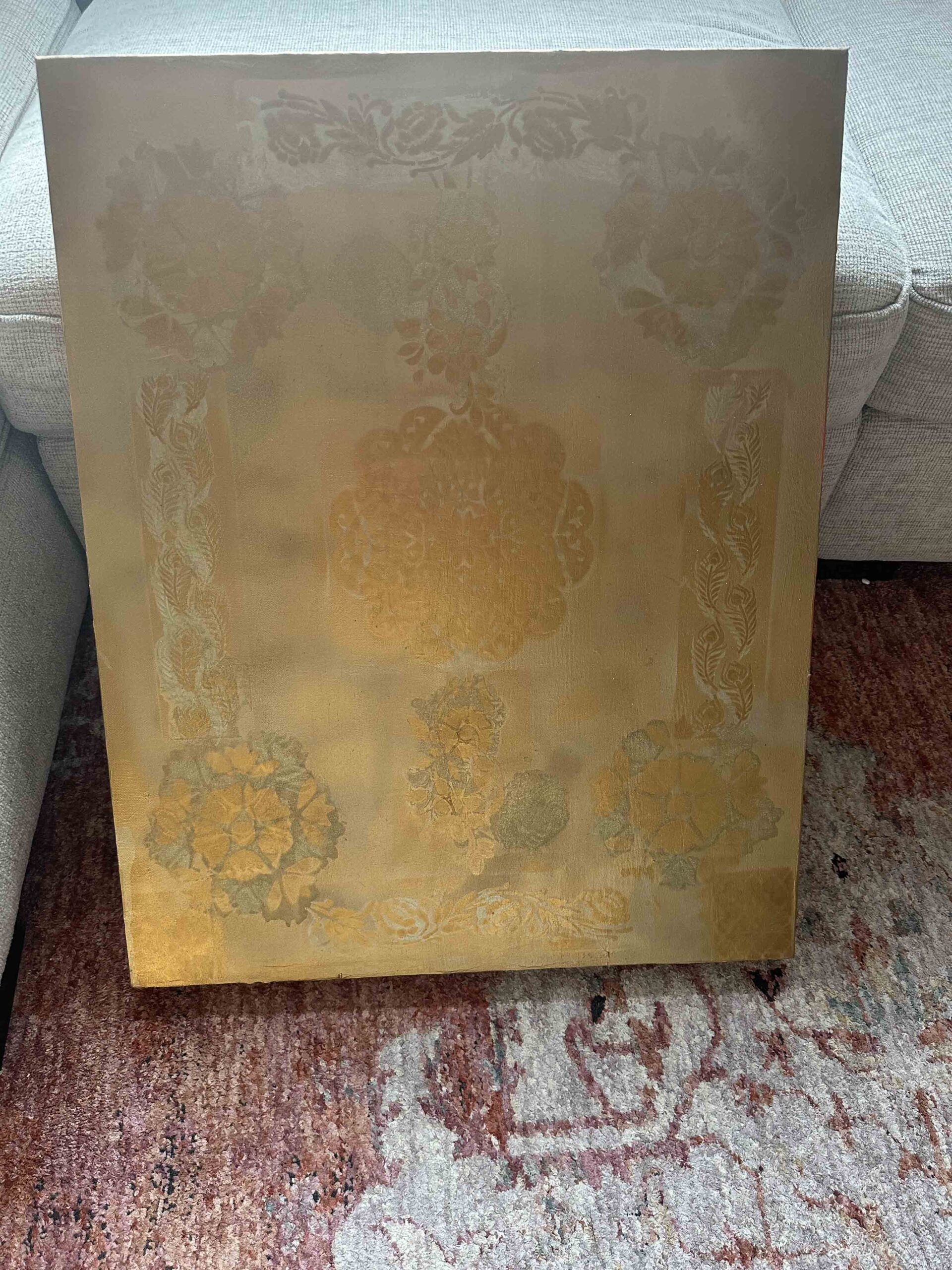 An expressive abstract painting that radiates warmth and energy. Layers of rich golden tones merge with bold contrasts, making it a luminous centerpiece for any room. Again based on the intricate art work found on the walls of magnificent forts in India.