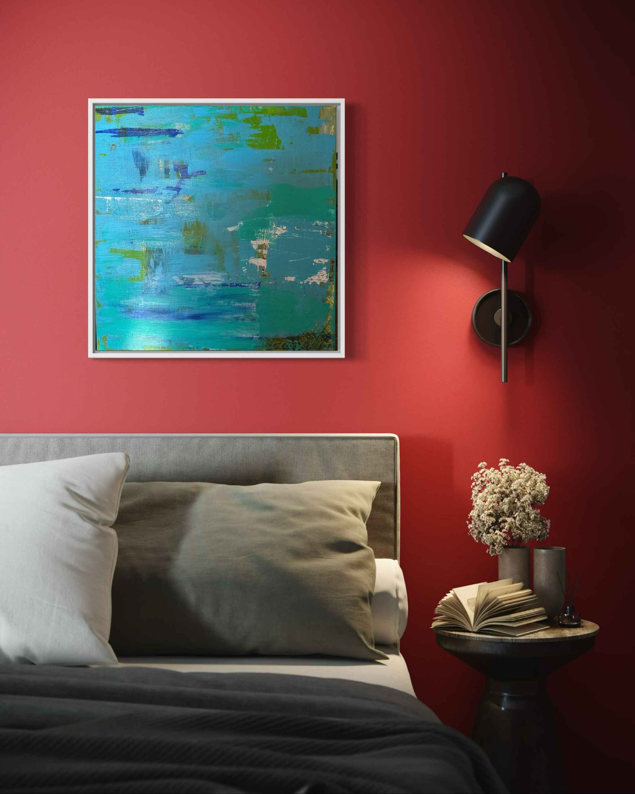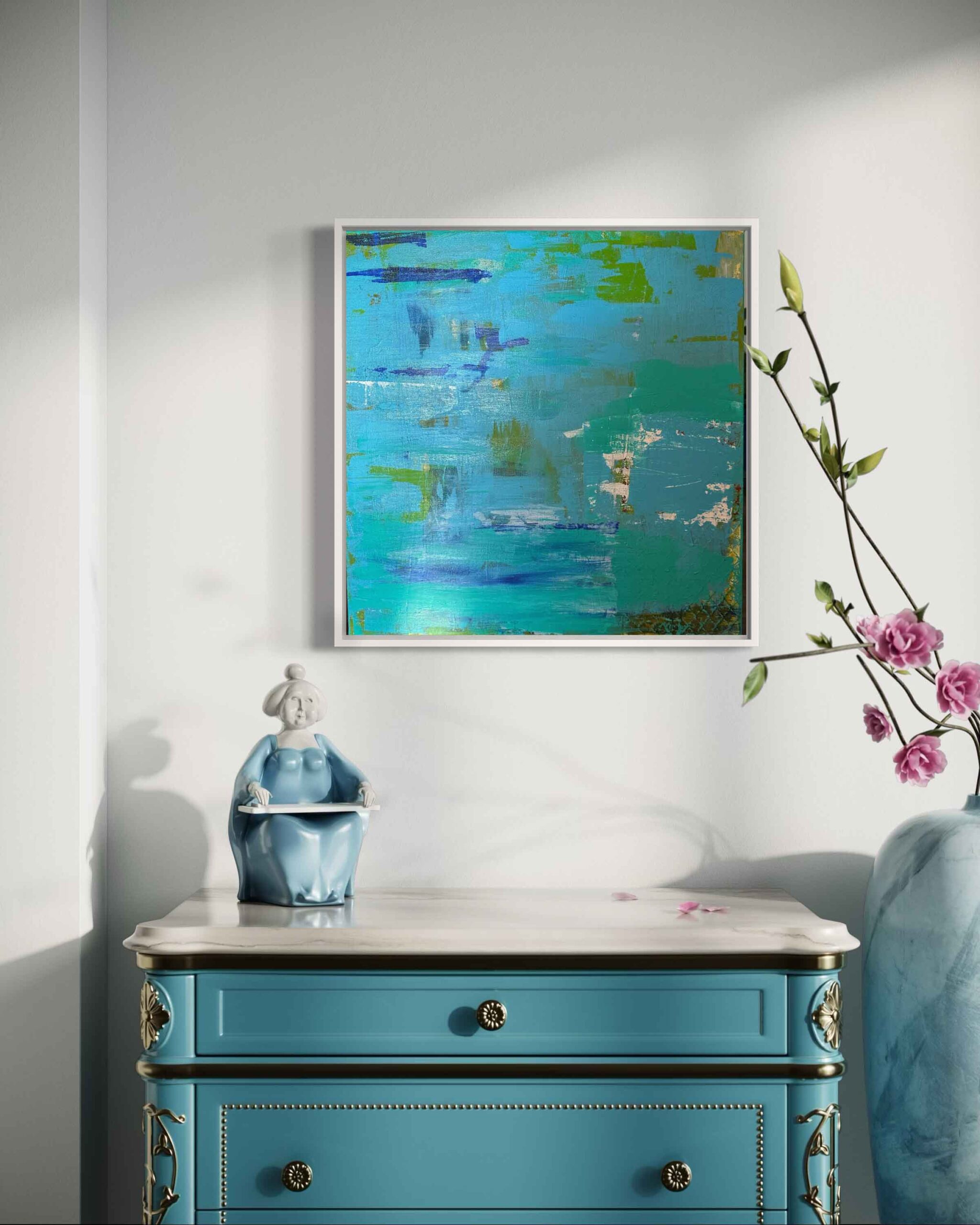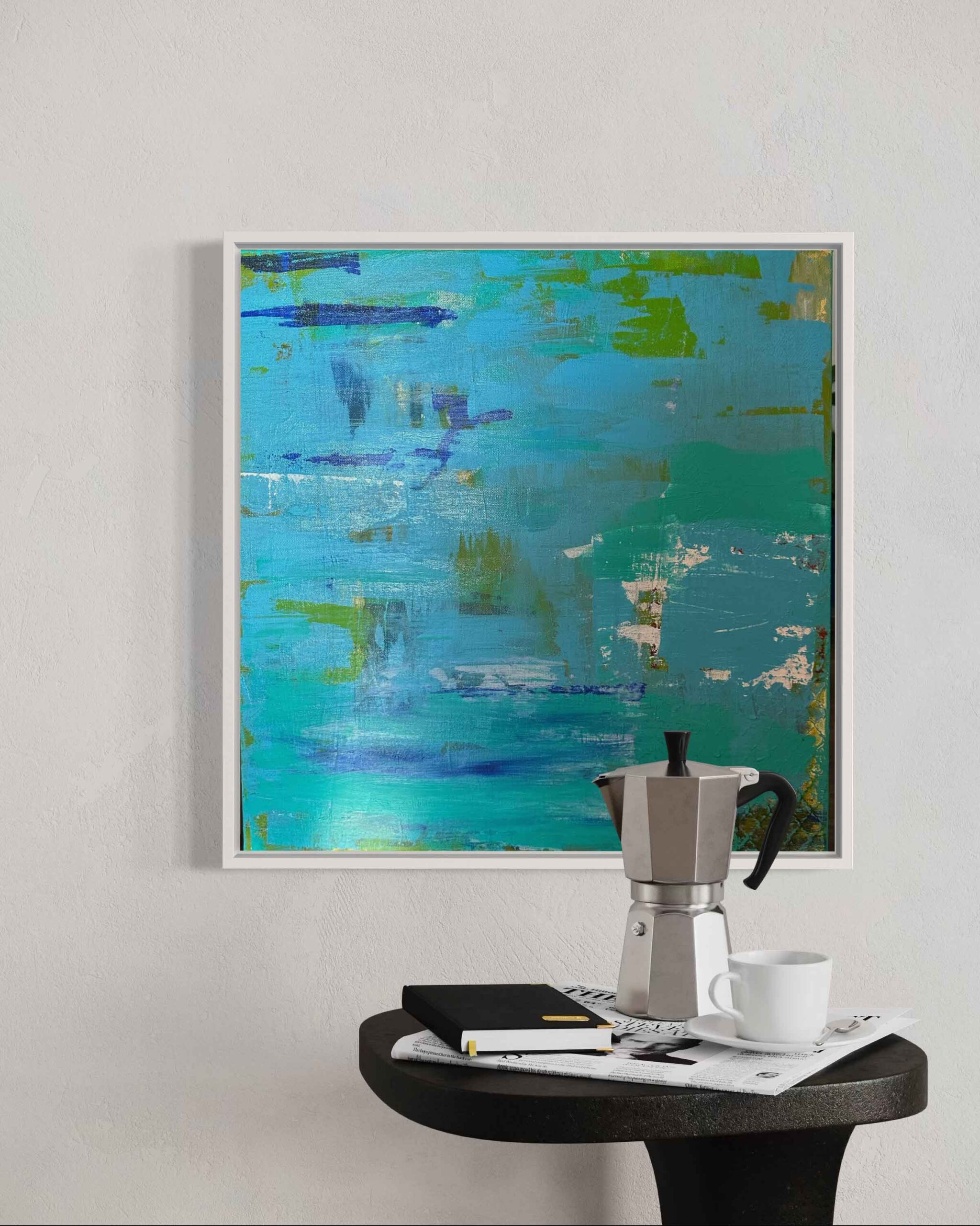 An uplifting abstract inspired by open skies. Soft shades of blue blend with airy textures, bringing lightness and tranquility to any space.